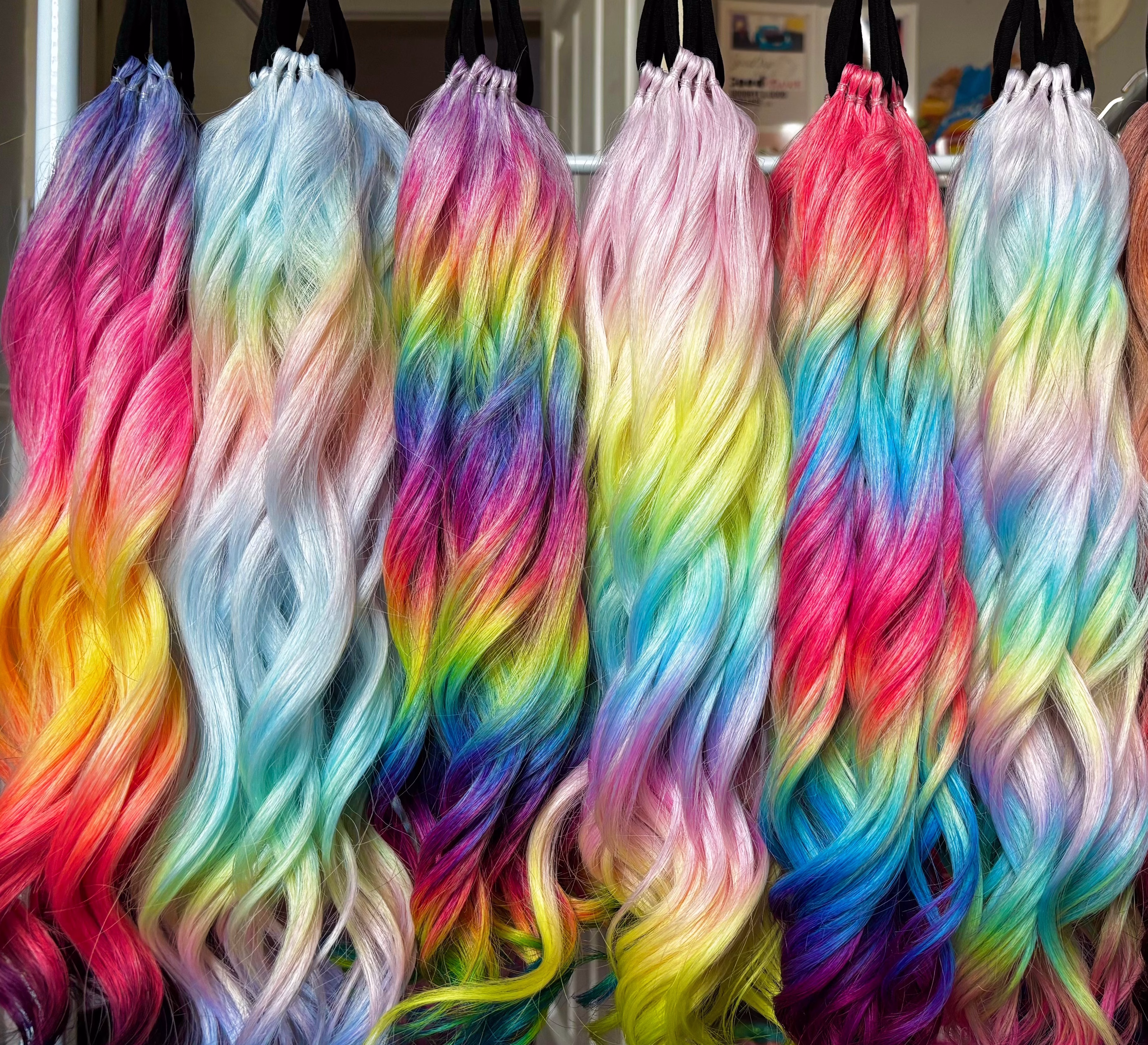 Turn heads and elevate your look with our Fantasy Rainbow Ombre Wavy Hair Extensions – the ultimate statement for anyone who dares to dream in color! These high-quality synthetic extensions come in an array of whimsical color blends and textures, perfect for cosplay, festivals, parties, or daily wear for the bold-hearted. Each set is made with soft, heat-resistant fibers and features easy-to-use black elastic loops for secure attachment.
